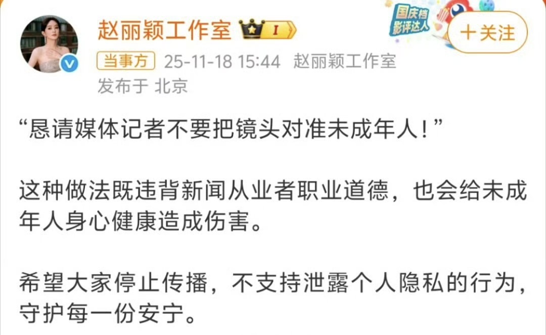 事件的起因可追溯至三个月前。9月19日,赵丽颖被拍到与6岁儿子想想手拉手过马路,相关视频登上热搜后,她首次以母亲身份发文呼吁保护未成年人隐私。但偷拍行为并未因此停止,11月18日,当工作室再次发布声明时,网友发现此类跟踪拍摄已持续数月。有粉丝透露,狗仔甚至长期蹲守儿童剧院,这种突破底线的行为引发公众对未成年人身心健康的担忧。