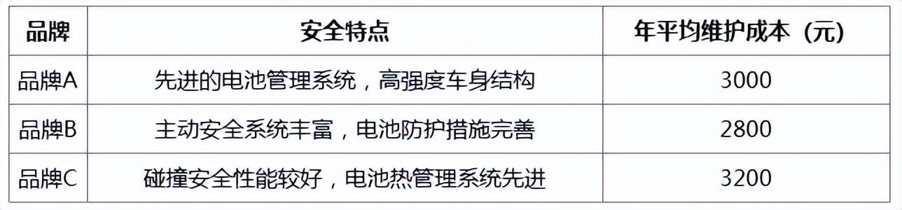下面通过一个表格来对比不同品牌新能源汽车在安全性和维护成本方面的差异: