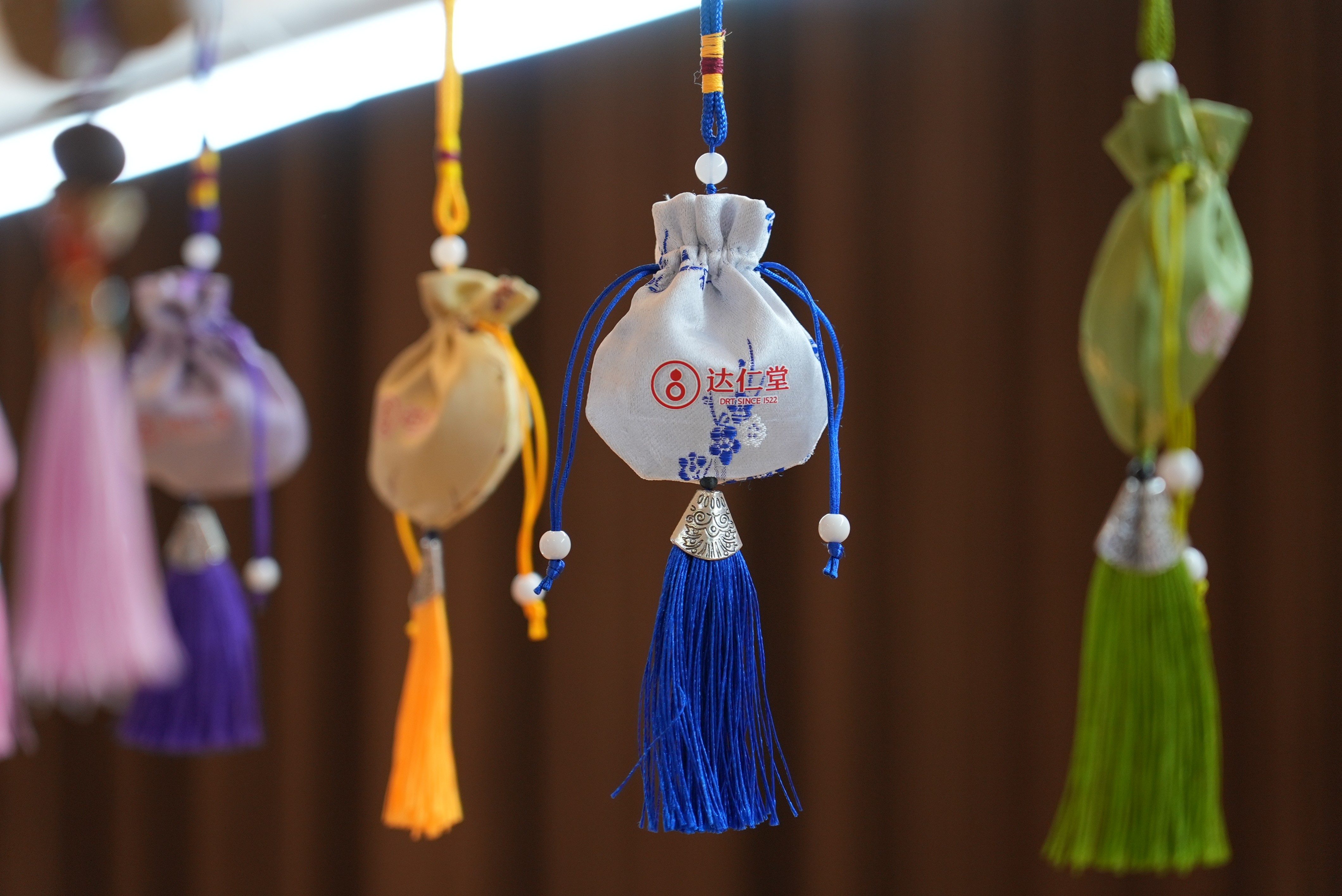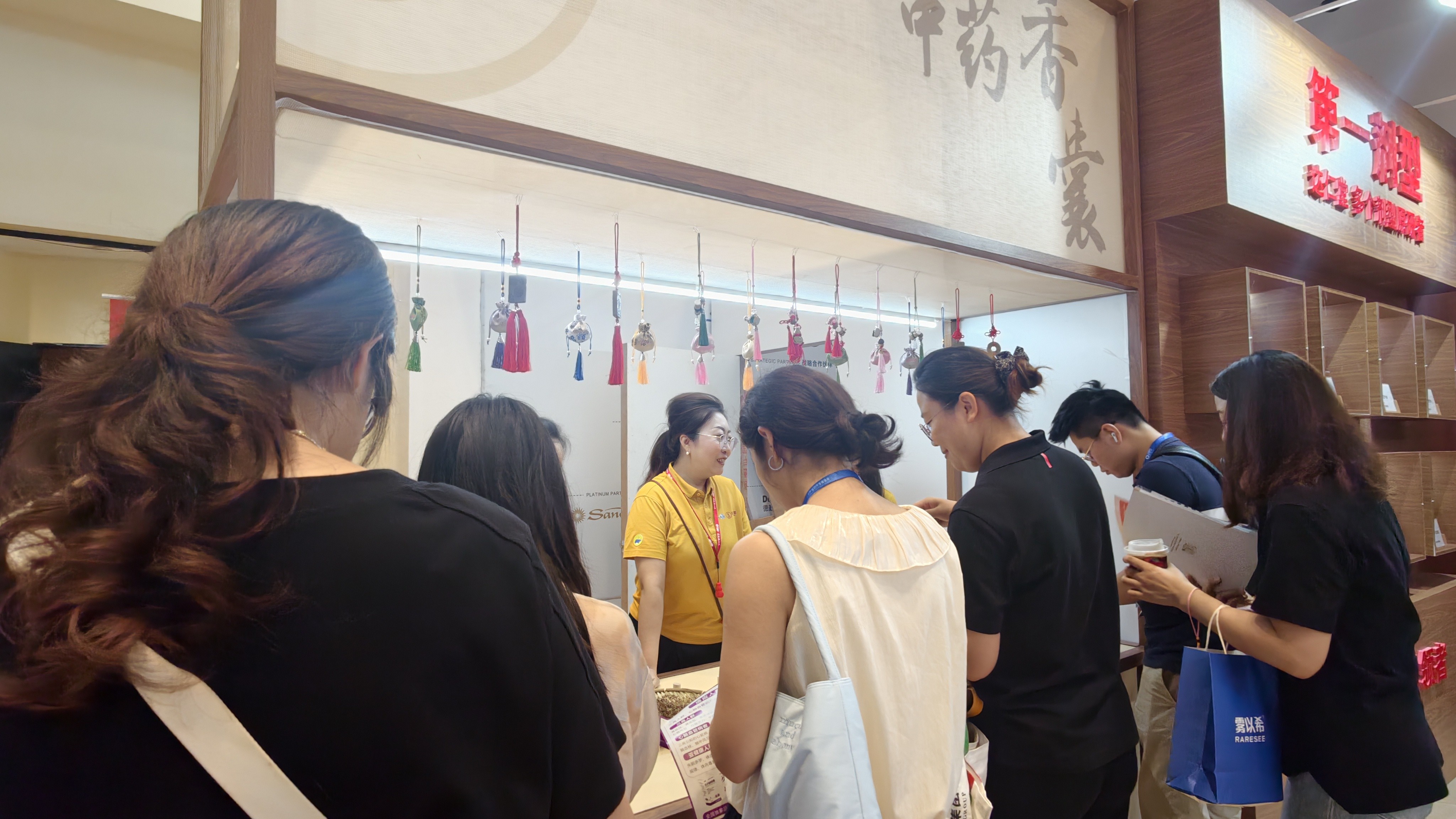 展区另一侧的香囊DIY,阵阵药香引来了众多好奇的观众。这里准备了多种中药材,参与者可以根据自身需求,调配专属的养生香囊。“枕月安眠”、“清宁一夏”、“疏影解忧”......这些充满诗意的配方名称,将中式美学演绎得淋漓尽致,也让人们把健康生活方式带回家。