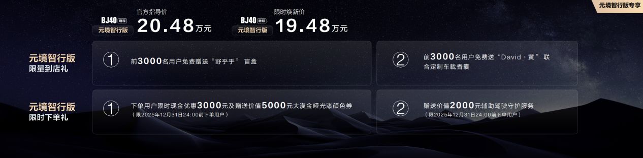 北京越野带来了元境智行版专享礼包:限量到店礼和限时下单礼。两项限量到店礼:前3000名用户,免费送“野乎乎”盲盒和北京越野与国际知名调香师David·黄联合定制的车载香囊。两项限时下单礼:第一项:从即刻起到年底下订用户,限时享现金优惠3000元;以及价值5000元的大漠金哑光漆颜色券。第二项:从即刻起到年底下定用户,限时赠送价值2000元的辅助驾驶守护服务。