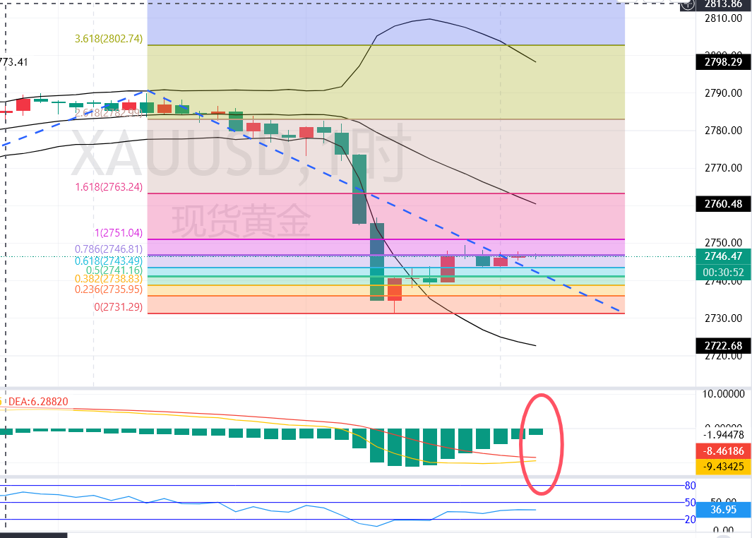 然后我们来看反应更迅速的现货黄金1小时k线图,可以看到,这次大跌把布林带从之前的横盘调整直接拉成向下扩口的看跌姿态,昨晚下跌的两根长阴线是直接刺破下轨,后续反弹后来到了目前46的位置。从斐波那契拓展线来看,未来黄金价格需要关注的几个阻力位分别为46.51.63,同时下方下跌动能柱收窄,金叉有要形成的趋势,在昨晚大跌进入超卖区间后开始调整。