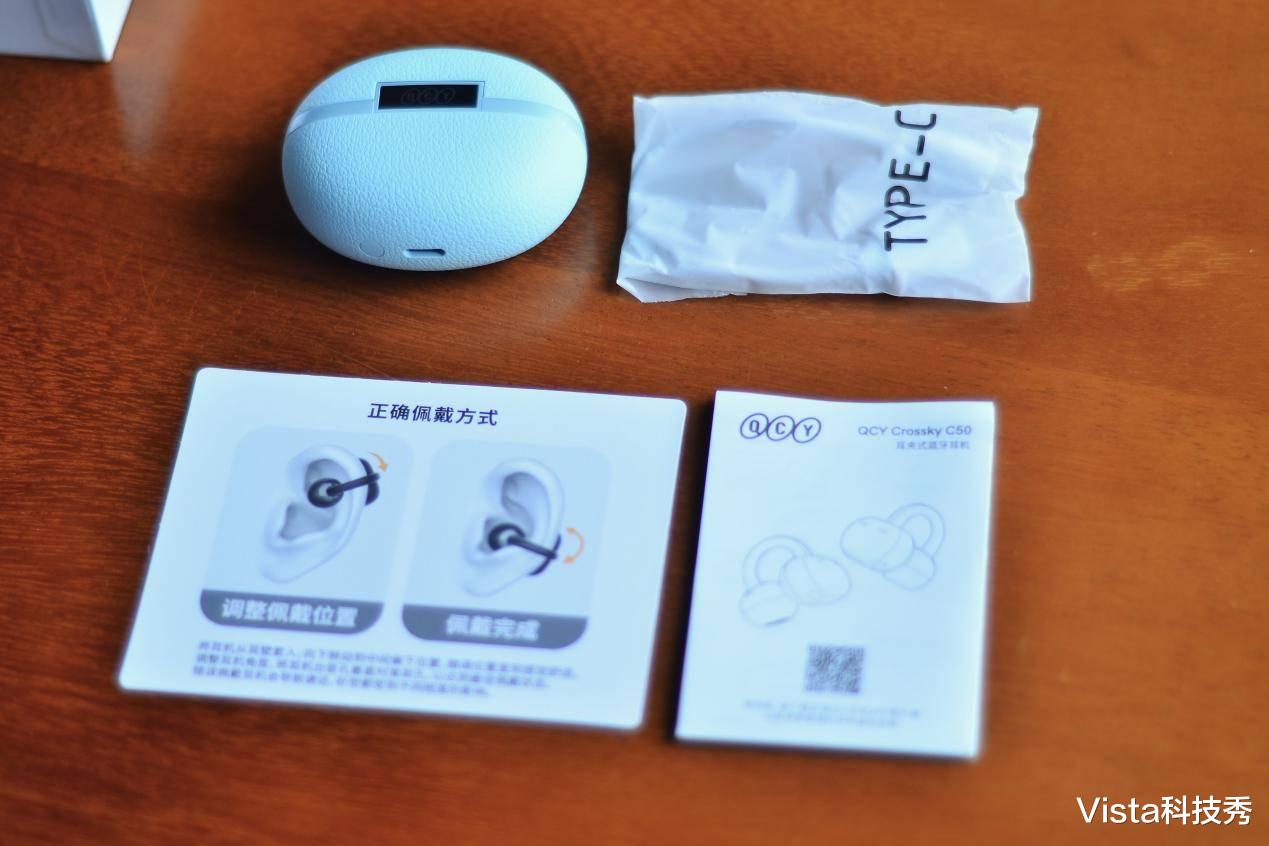 QCY C50配件包括充电仓,内含耳机,TYPE-C充电线、佩戴指引卡和使用说明书,简单明了。