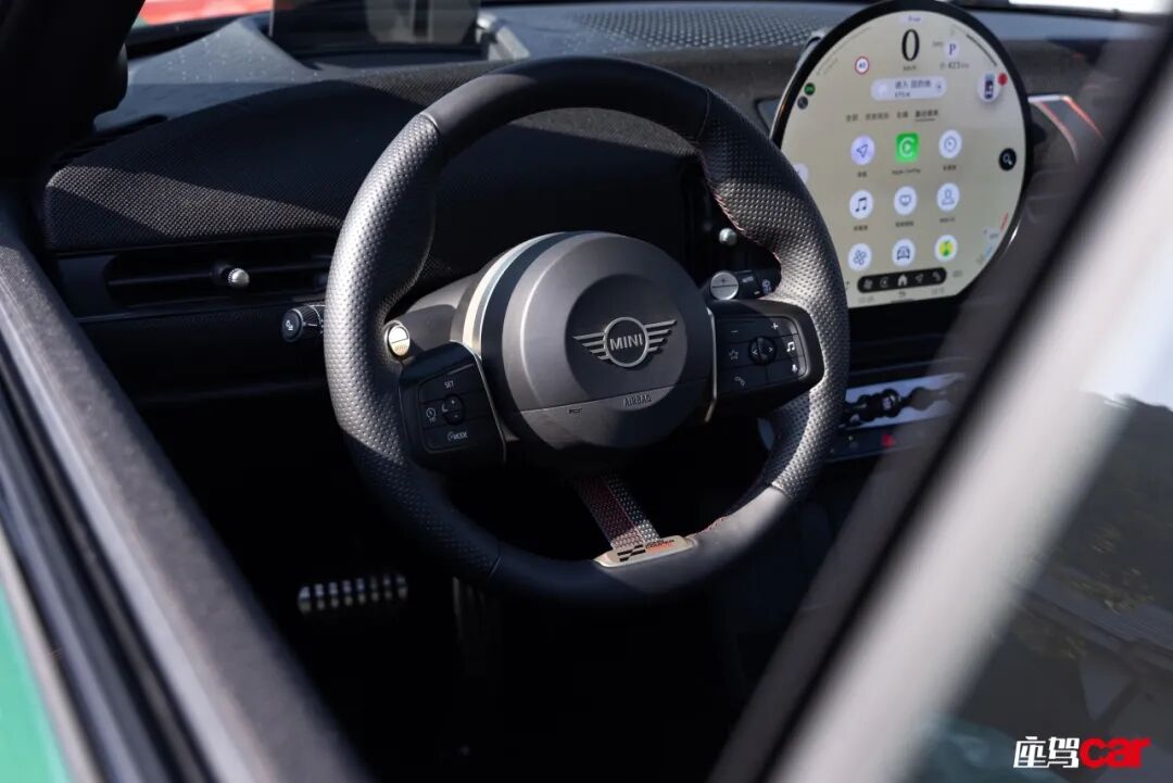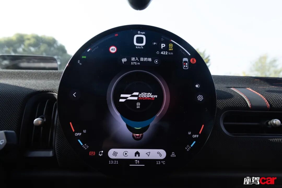 车内又是另一个完全不同的世界。F56年代的JCW有一种“机械感的小型战斗机”气质,实体按还原了初代MINI最经典的样子、驾驶氛围是热烈而直接的。新车则更像是MINI对未来数字化的一次豪赌:一块240毫米的圆形OLED屏幕就在你眼前,像是把整个MINI的情绪、技术与灵魂浓缩成一个发光的圆点。它是车机,更是MINI的新舞台。JCW专属界面更像是数字赛车仓的元素堆栈,启动时的动画、模式切换时的红色光影、JCW音效模拟,都让你意识到这套系统不只是为了方便,而是为了“情绪价值”。在这台车里,科技不是冷冰冰的工具,而是能增幅驾驶欲望的一种能量。