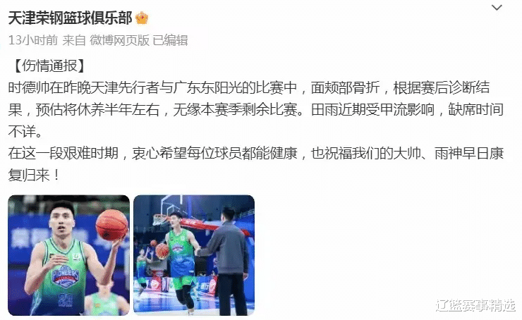天津男篮官方宣布时德帅对阵广东的比赛中面部骨折赛季报销。