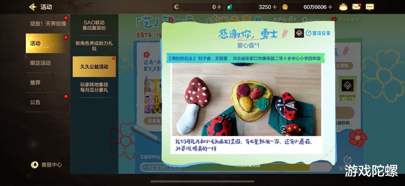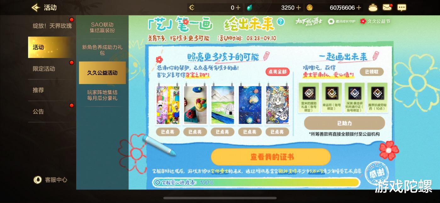 玩家的参与方式在简单灵活之余,更做到了无负担低门槛。只要在游戏内捐出1元,即可收获游戏回馈的充满诚意的游戏爱心回礼,获得1点爱心值用以助力进度条。同时,在活动专属页面点亮乡村孩子的画作,同样能为全服爱心进度条助力。