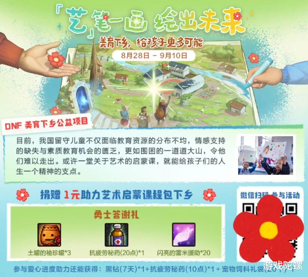 当全服爱心值顺利达到目标后,DNF 将以全体玩家的名义,通过腾讯基金会,为更多乡村儿童送去艺术启蒙资源,让这份由“打团精神”凝聚的公益力量,切实为孩子的未来铺路。