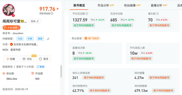 网红“周周珍可爱”,视频内容主要分享美妆护肤。她在抖音、快手、小红书三家平台粉丝量分别为584.9万、5044.0万、2.7万,其中在快手平台的简介显示,吉尼斯水乳精华销量王、快手平台国补合伙人。