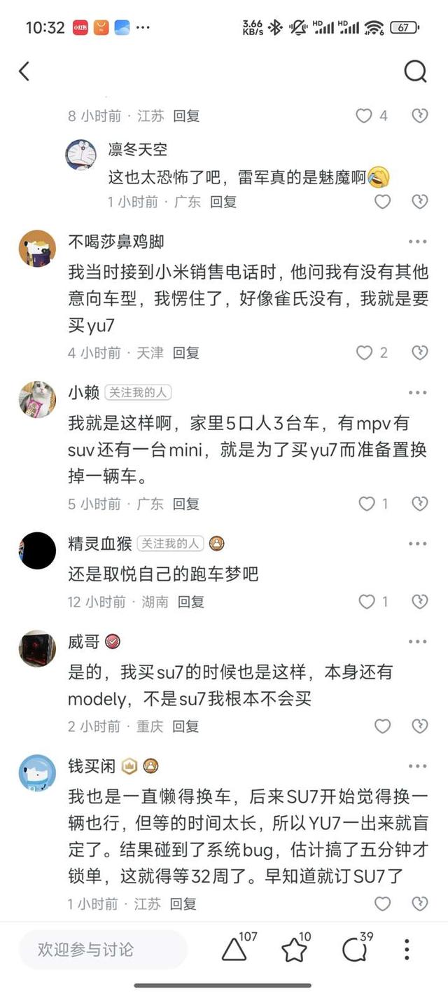 意义有限是因为,很多用户是来买YU7的,不是来买车/换车的下面三张图,分别是我的一位当晚盲订的朋友、我在社交媒体讨论这个话题时评论区其他准车主的反馈还是孙少君的调研结果,都说明了一件事——YU7的购买者,基本没有对比其他车。