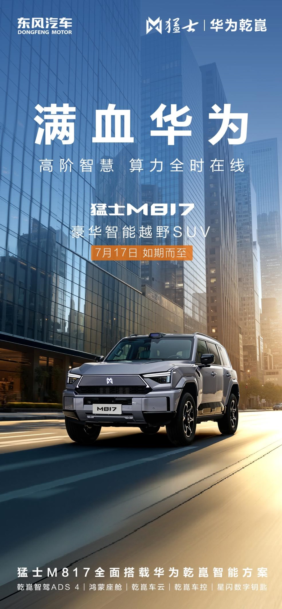 7 月 17 日,东风猛士科技将举办 "风华正猛 —— 猛士 M817 技术发布暨新车预售发布会"。作为首款全栈搭载华为