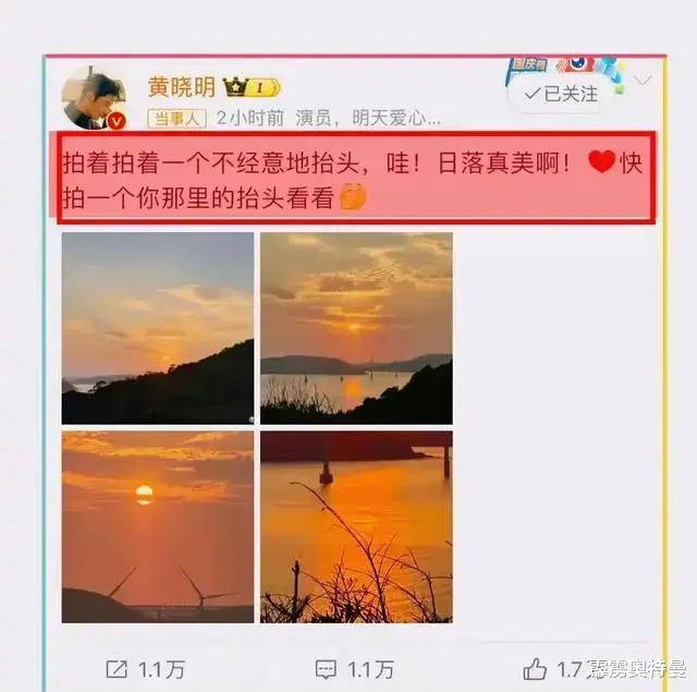 话说回来,黄晓明那组落日余晖的照片确实拍得不错,夕阳无限好,只是近黄昏。这句诗配上他那句"欢乐豆是吗",倒真有几分文艺范儿。在娱乐圈这个大染缸里,能保持这份从容淡定,也算难得。