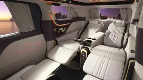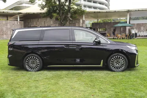 车身侧面,大量平直的线条勾勒出稳重的车身姿态,镀铬饰条的点缀则增添了几分精致感。电动吸合门与电动侧滑门的配置,不仅操作便捷,更提升了上下车的仪式感。大尺寸的 20 英寸轮毂采用全新造型,搭配 255/50 R20 规格的轮胎,进一步彰显了车辆的气场。值得一提的是,车辆解锁时,外后视镜与尾标处集成的蓝色呼吸灯缓缓亮起,如同在向主人轻声问候,科技感与仪式感满满。
