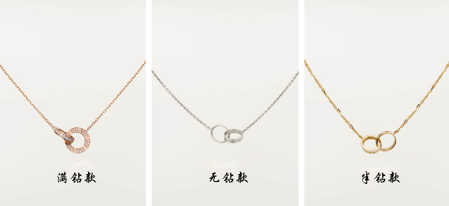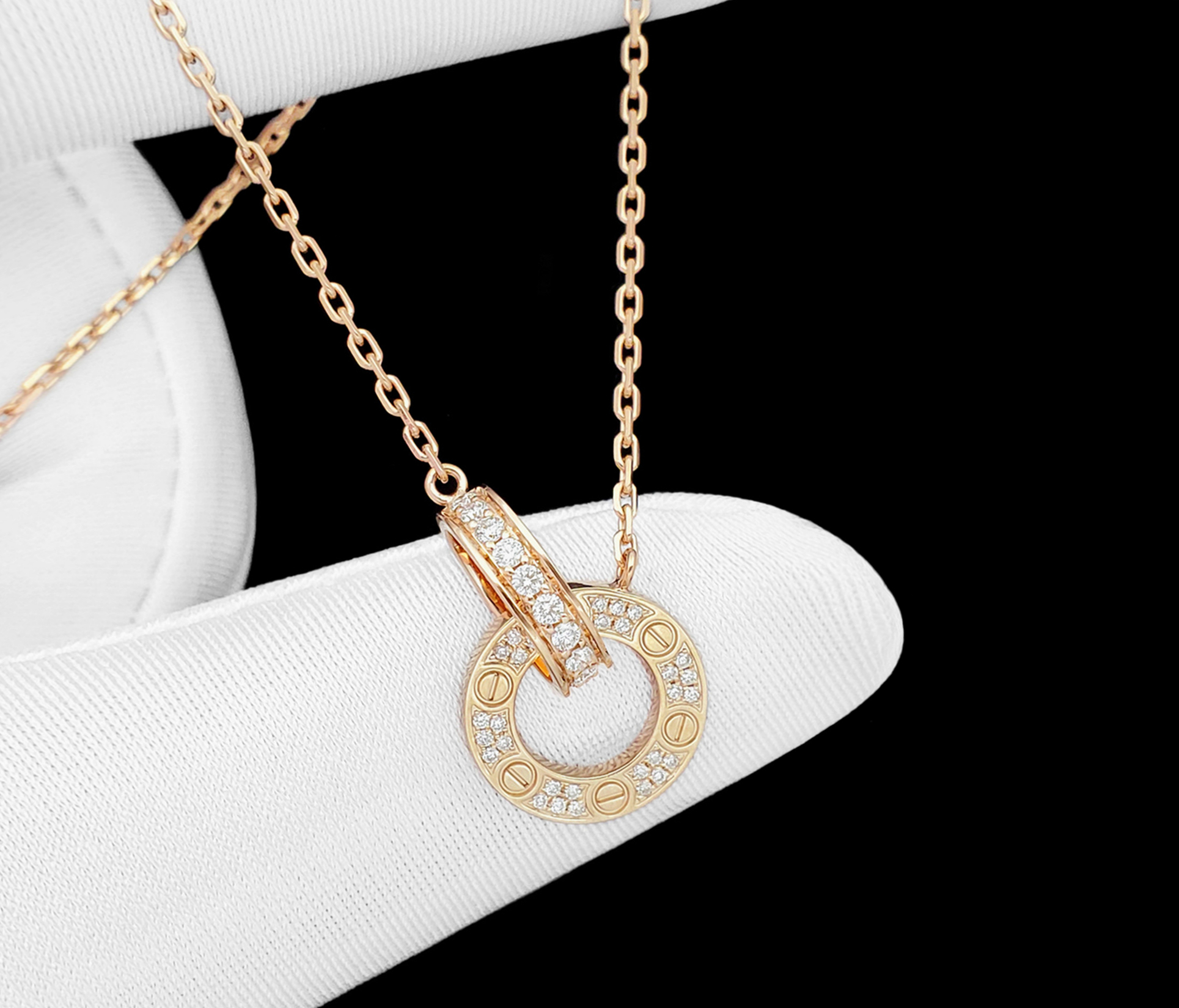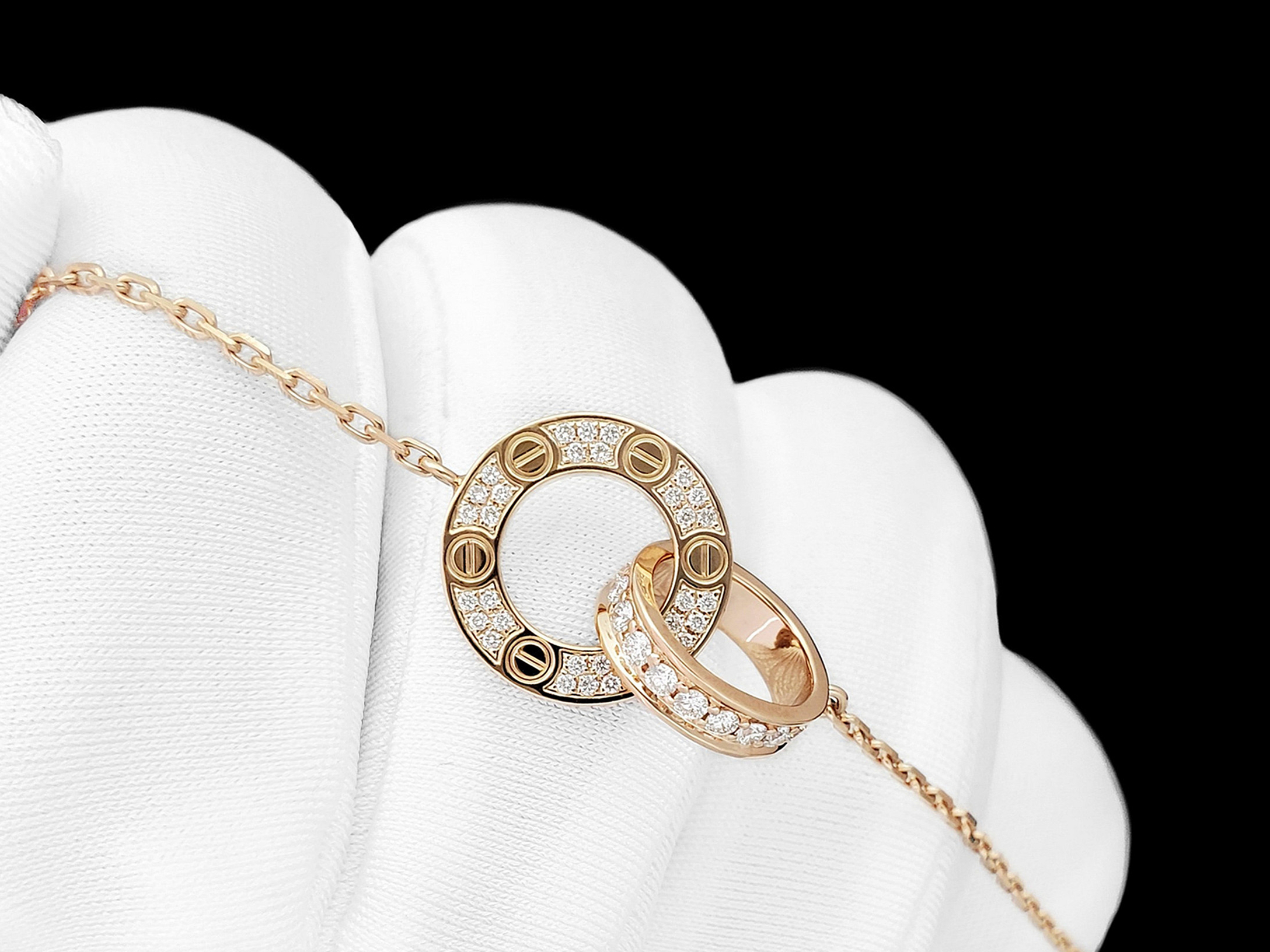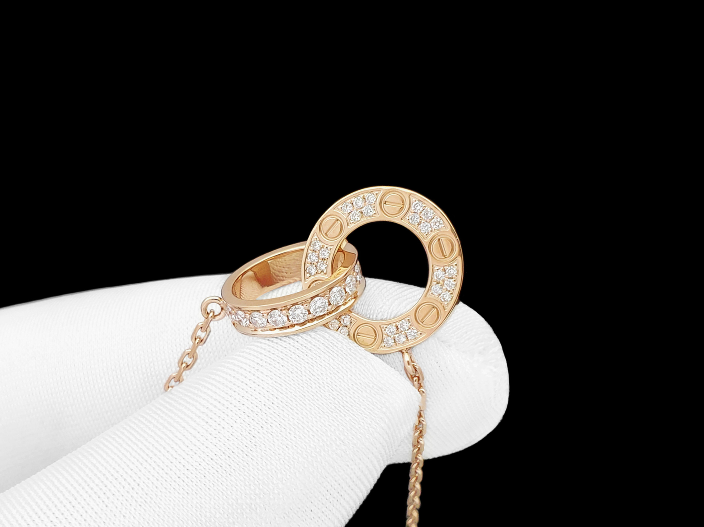Cartier卡地亚Love系列18K玫瑰金满镶钻石小饼双环项链