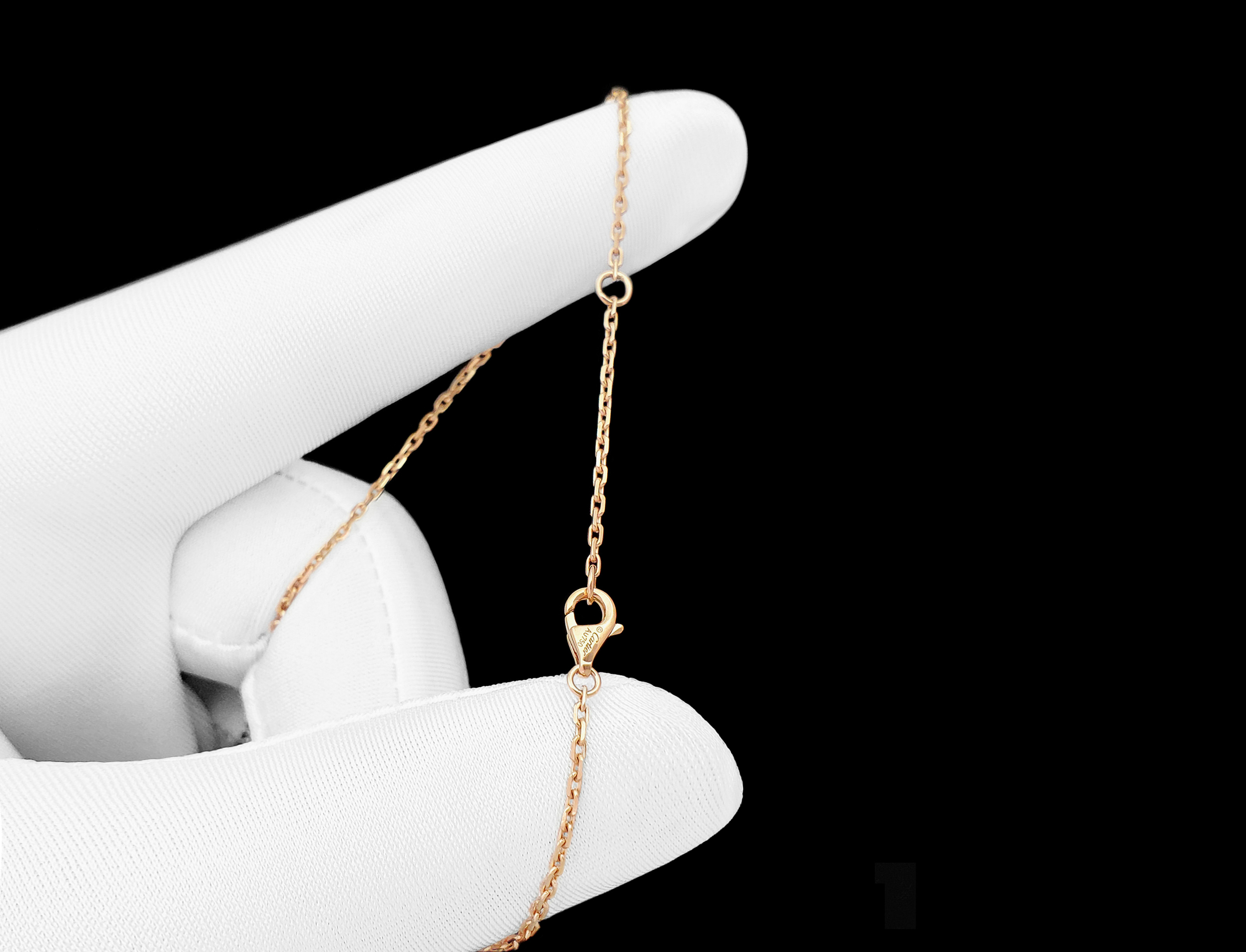 双环两端各焊接一个小巧的连接环,连接环挂着精致的十字链,椭圆环链条上设有小号的龙虾扣,扣子上印有住珠宝的具体信息,而小饼环侧的链条上设有两个调节扣,分别对应38-41厘米的长度,佩戴者可在此范围内自由舒展。