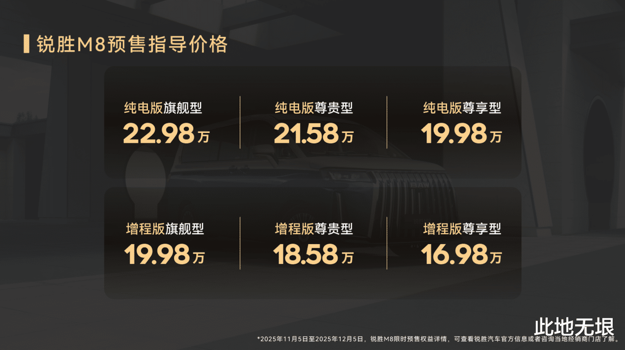 11月5日,北京汽车制造厂旗下锐胜汽车在青岛发布大型MPV锐胜M8,以增程版16.98万元起、EV版19.98万元起的预售价格,直接切入当前MPV市场的核心空白地带。据市场数据显示,当前15-20万元价格区间内,大型MPV产品供给严重不足,锐胜M8首次在该价位区间实现“大型MPV+商务级配置”的组合,填补了市场断层。