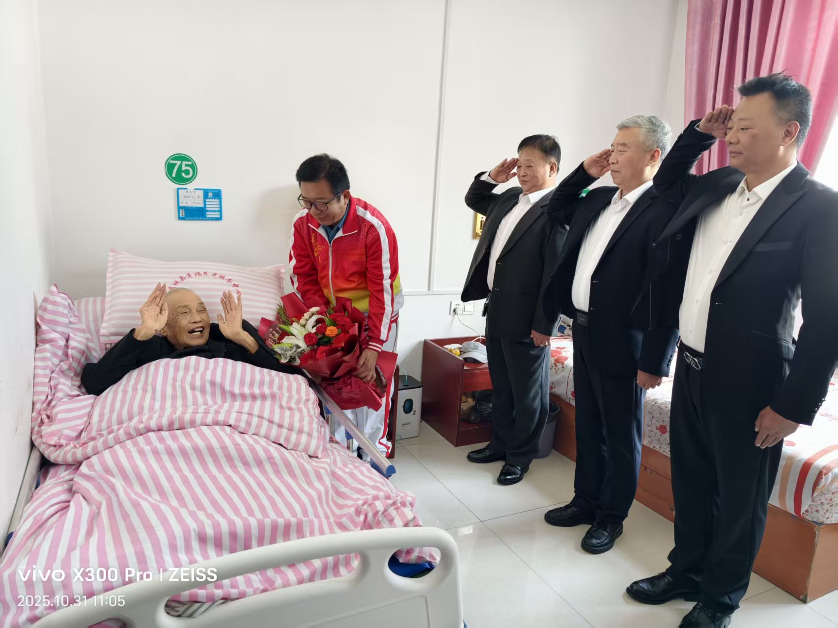 随后,一行人又来到抗美援朝老兵季洪全的住处——这位原籍潢川城关、已在敬老院生活三年的老英雄,接过鲜花的瞬间,艺术团代表庄重敬上军礼,以崇高敬意致敬他曾为国家与人民立下的功勋,老兵眼中的泪光,映照着跨越岁月的敬意与温暖。
