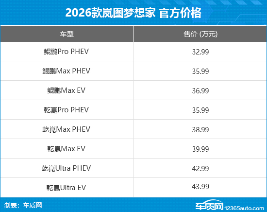 9月15日,2026款岚图梦想家正式上市,新车共推出8款车型,售价区间为32.99-43.99万元,提供纯电和插混两种动力形式。此外,官方还推出用车无忧、服务无忧等购车权益。