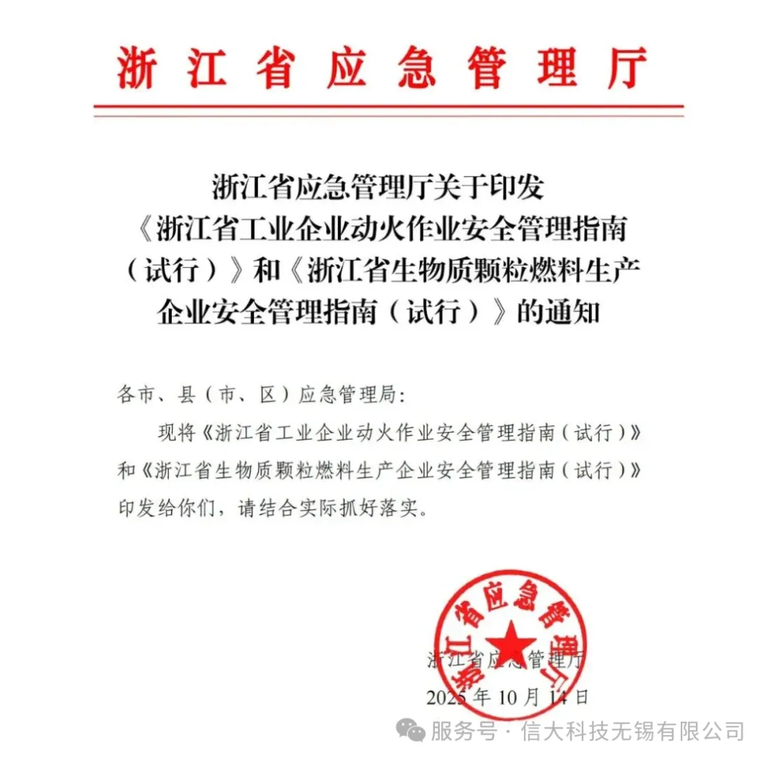 10月14日,浙江省应急管理厅发布两项试行指南,对动火作业、颗粒燃烧物生产提出新要求。《工业企业动火作业安全管理指南》明确动火作业定义、分级,规范审批、监护、培训等要求,细化相关人员职责及作业票管理;《生物质颗粒燃料生产企业安全管理指南》针对该类企业,从总体布置、设备设施、电气、消防、粉尘防爆等方面提要求,同时强调管理与应急措施。
