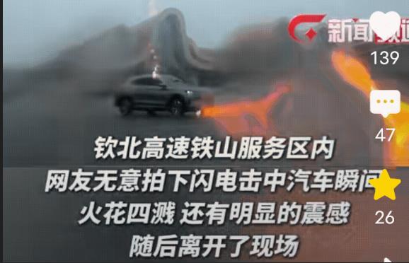8月5日,广西北海铁山服务区上演了一场“电闪雷鸣”的科幻大片。两辆私家车前一后驶出服务区,后车还在慢悠悠挪动,突然——“咔嚓!轰!”一道闪电直劈车顶,火花炸裂如烟花!围观群众惊叫未落,闪电竟又连劈两次,三声巨响震得人耳膜发麻,现场宛如特效大片拍摄现场。