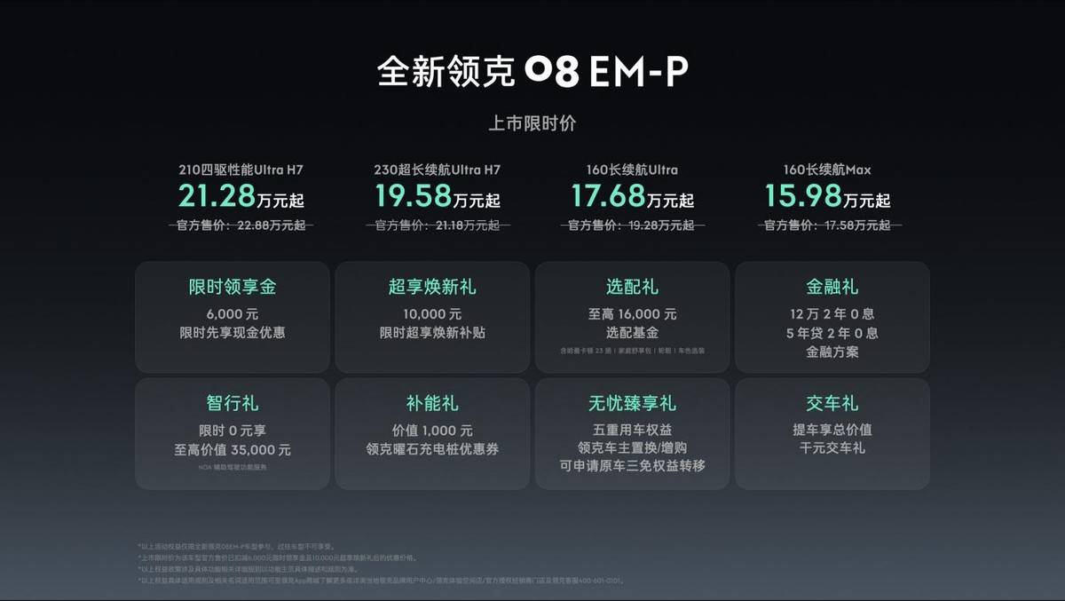 【2025年9月24日 上海】今日,“家庭豪华智混SUV”全新领克08 EM-P正式上市。新车提供160长续航Max、160长续航Ultra、230超长续航Ultra H7、210四驱性能Ultra H7四款车型可选,官方限时价15.98万元-21.28万元。同时,伴随新车上市还有限时领享金、超享焕新礼、选配礼、金融礼、智行礼、补能礼、无忧臻享礼、交车礼在内的8重限时福利。
