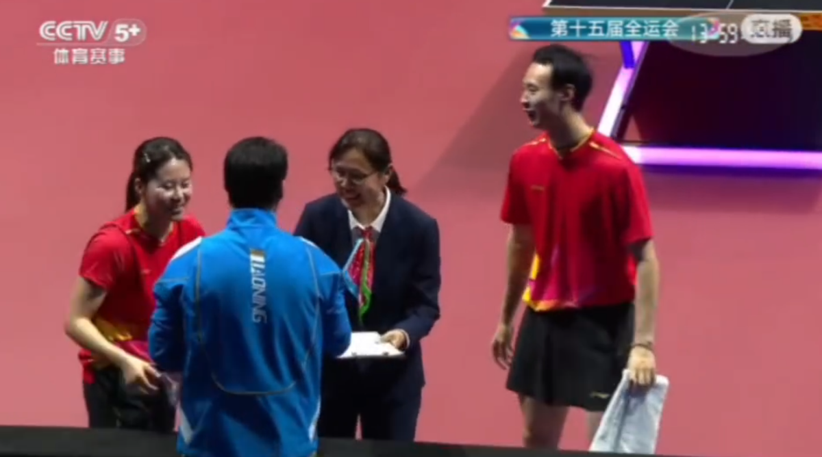 在经过裁判的确认之后,运动员完成了剩余的比赛,徐海东/陈幸同在第5局以12-10拿下,最终4-1的大比分获胜,徐海东则是再次庆祝胜利。