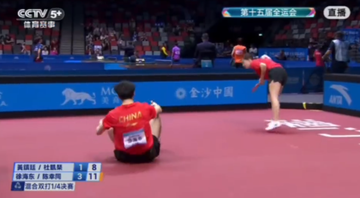 不过,后面三局比赛,徐海东/陈幸同打得更好,11-5、11-8、11-8连得3分,将大比分变成了3-1。就在此时,辽宁队的球员徐海东突然躺在地上庆祝。