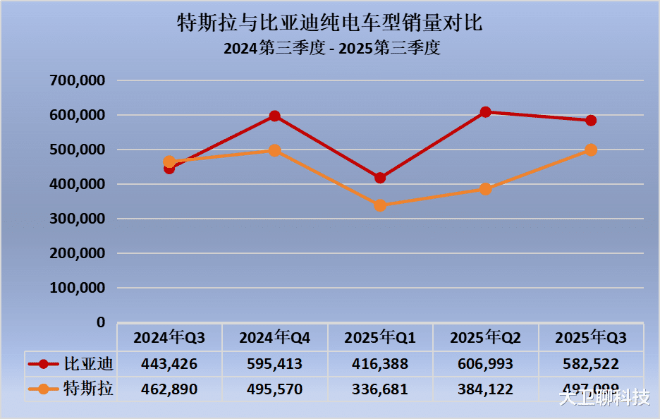 近日,官方发布了一组产销数据,可以看到,比亚迪全面压制特斯拉,连续4个季度取得领先。2025年Q3季度,比亚迪纯电车型的销量达到了58.2万辆,而特斯拉的交付量则只有49.7万辆,仅这一个季度,特斯拉的销量就落后了8.5万辆。
