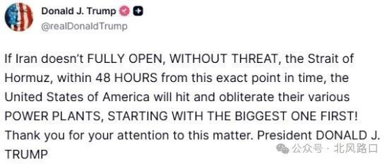 3月21日晚间,特朗普向伊朗发出48小时最后通牒,要求伊朗重新开放霍尔木兹海峡通行,否则将打击并摧毁其所有发电厂,首先摧毁最大的发电厂。