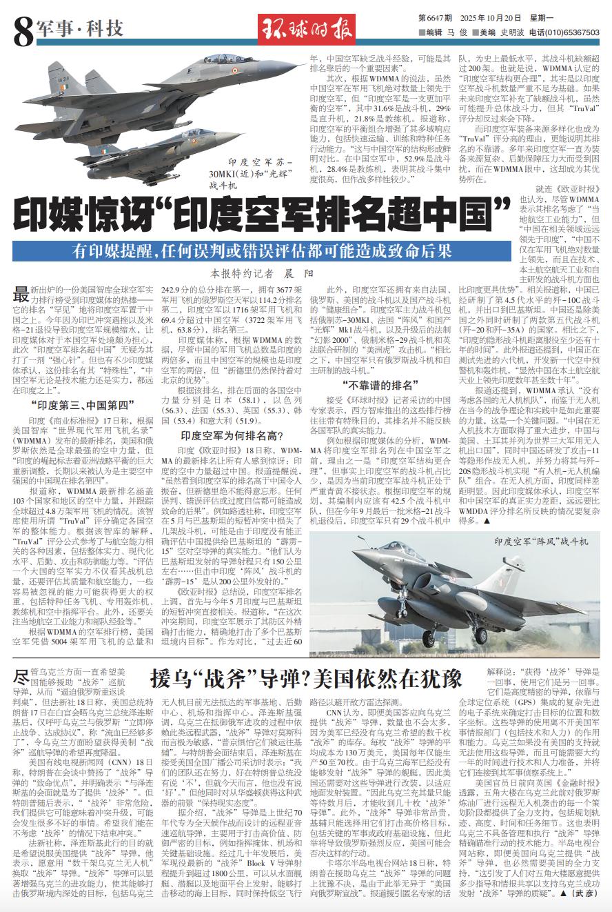 印度《商业标准报》17日称,根据美国智库“世界现代军用飞机名录”(WDMMA)发布的最新排名,美国和俄罗斯依然是全球最强的空中力量,但“印度的崛起标志着亚洲战略平衡的巨大重新调整,长期以来被认为是主要空中强国的中国现在排名第四”。