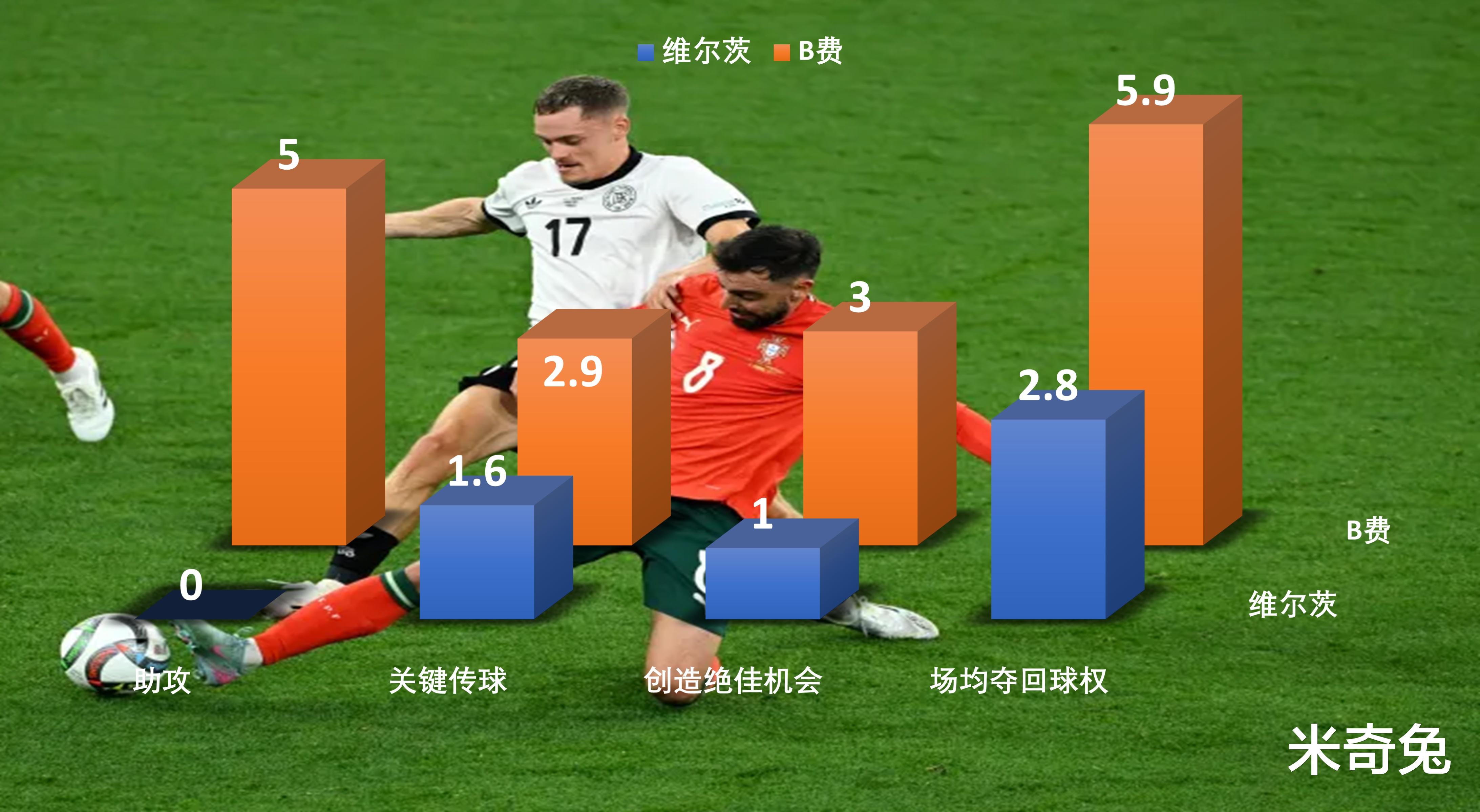 B费创造绝佳得分机会、关键传球和助攻都远超维尔茨的情况下,场均抢回球权次数还能翻倍于维尔茨,攻防两端存在感都远比维尔茨来得好。