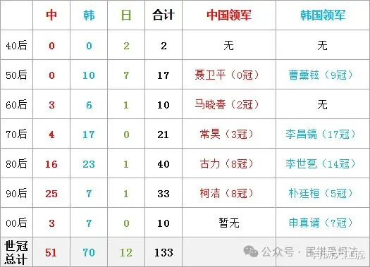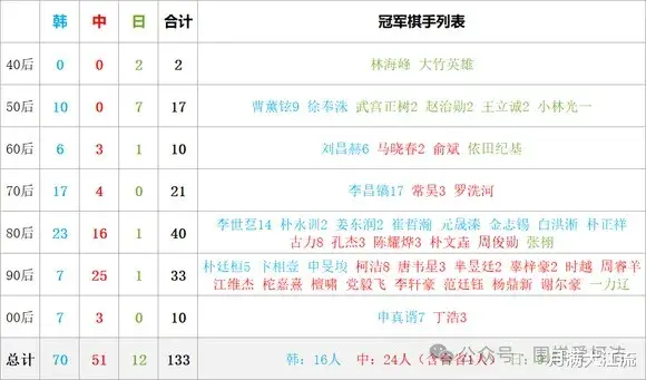 截至2024年12月,世界棋坛共产生围棋个人世界冠军133个,其中韩国获得70个,中国棋手获得51冠(包含中国台湾棋手1冠),日本获得12冠。