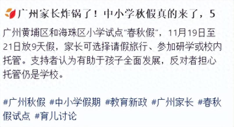 海珠区教育局工作人员也明确回应,未接到辖区内小学试点春秋假的相关通知,网传放假安排与实际情况不符。