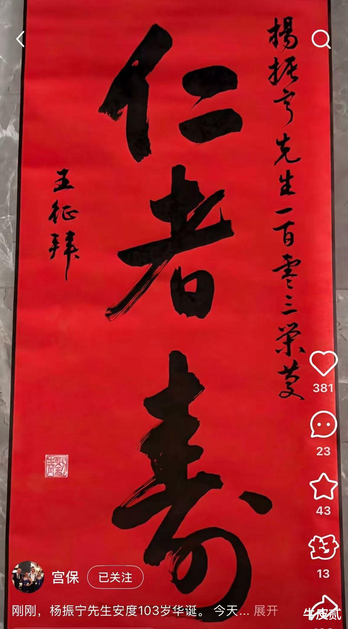 恰巧,王征当日带来的贺礼是一幅亲笔书法,恭贺杨振宁103岁寿辰。这幅字当场被悬挂于杨家墙上。