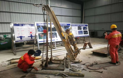平台搭设:工作平台距工作面2.3米,由工字钢、槽钢与钢板组装而成,结构牢固,钻机通过专用U型卡固定。