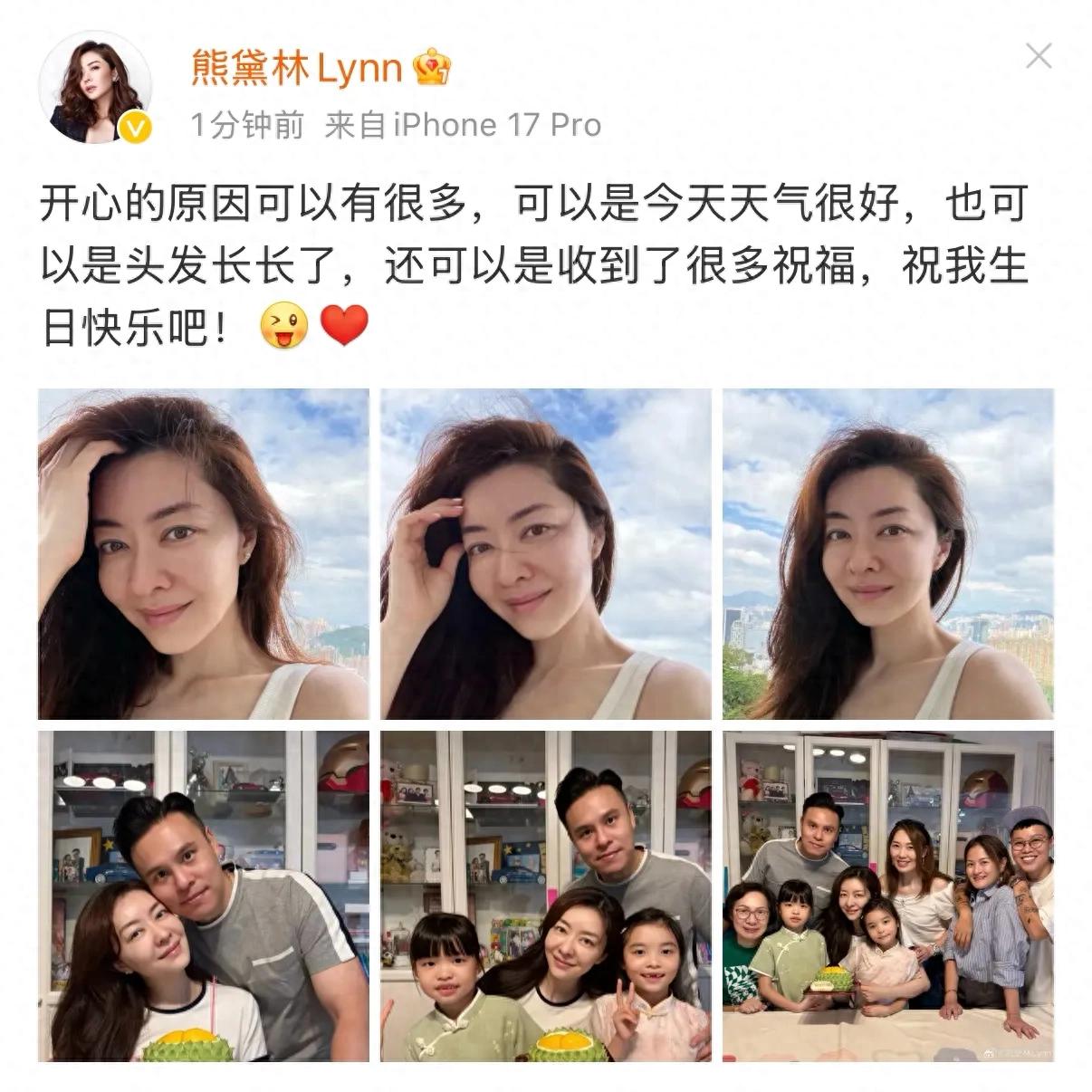 熊黛林45岁生日,她在社交平台晒出全家福庆生,并配文“开心的原因可以有很多,可以是今天天气很好,也可以是头发长长了,还可以是收到了很多祝福,祝我生日快乐吧”。