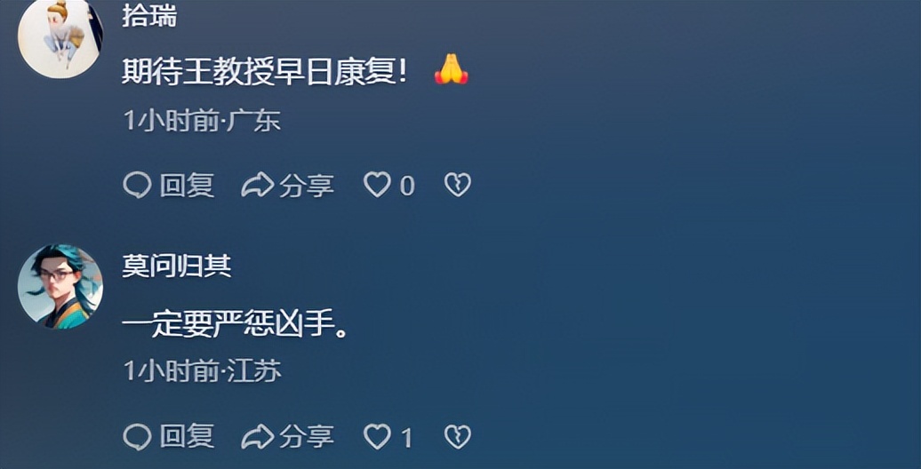 对此事,有很多网友都建议有关方面对行凶者严惩,这样才能保护医护人员安全。别的不说,如果不严惩的话,亲眼见到王教授遇袭的那两个同学能不能开到做医生的未来,他们担不担心,害不害怕。