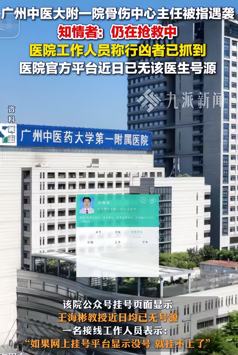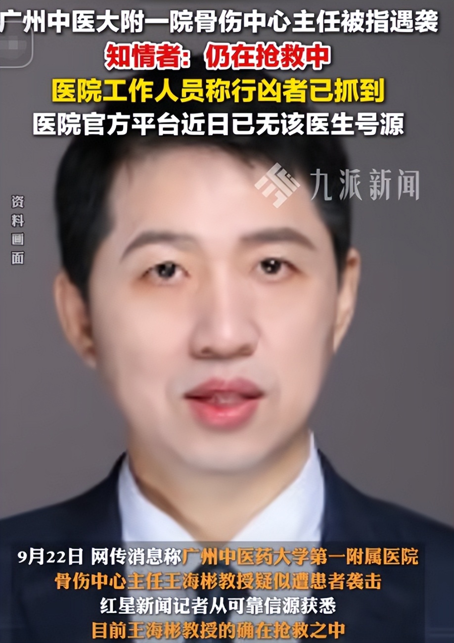 人在工位坐,祸自天外来!九派新闻的消息,9月22日,广州中医药大学附属医院一名教授王海滨博导疑似因为医患纠纷被患者袭击。目前行凶者已经被抓住了。王教授仍在抢救中。