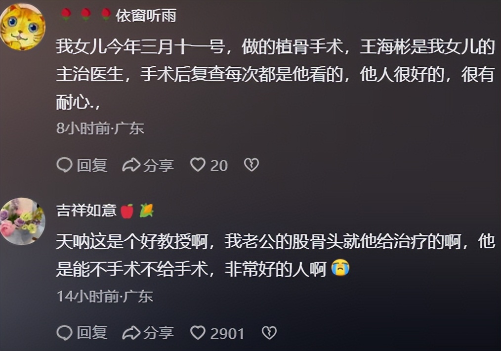还有患者说:我女儿今年三月十一号,做的植骨手术,王海彬是我女儿的主治医生,手术后复查每次都是他看的,他人很好的,很有耐心.。