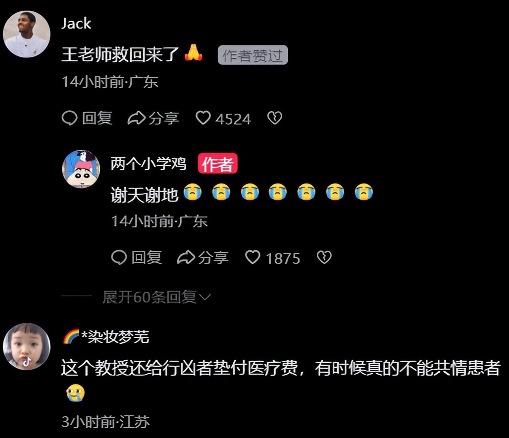 不过疑似有知情人曝,目前王教授已经无生命危险。据说当时王教授还带着两个学生一起进行诊断,学生没有受伤,而凶手持刀突袭王教授,王教授多处受伤,从该校学生曝光出来的诊断内容,受伤的诊断内容高达20多项。