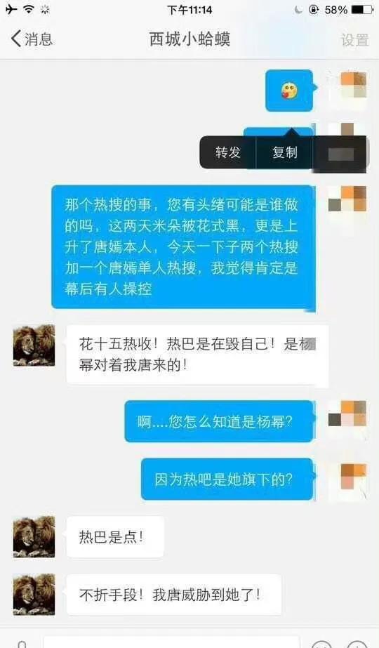 有网友晒出聊天截图,称最近米朵被黑,并且上升到唐嫣身上,是杨幂对唐嫣下手,原因是唐嫣威胁到杨幂。