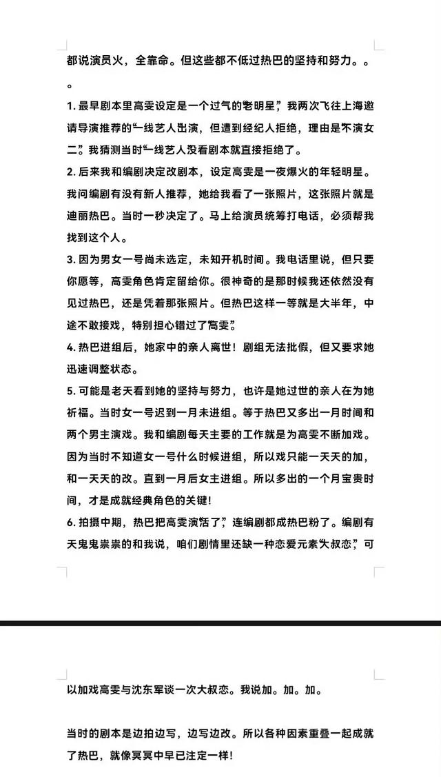 据刘制片人表示由于女一号迟到一个月未进组,所以他和编剧就为热巴不断加戏,最后编剧都成了“热巴粉”,才有了电视剧中高雯和沈东军“大叔恋”。