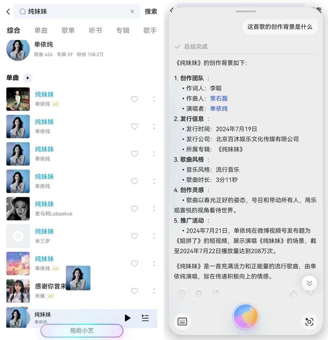 而且在鸿蒙版酷狗上我还发现了一个好玩的功能,那就是“统一拖拽”。有时候听到一首宝藏歌曲,特别好奇它的背景故事,只要长按住歌曲封面,把它拖给小艺,歌手资料、专辑信息啥的立刻就出来了。整个过程行云流水,满足好奇心变得超简单。