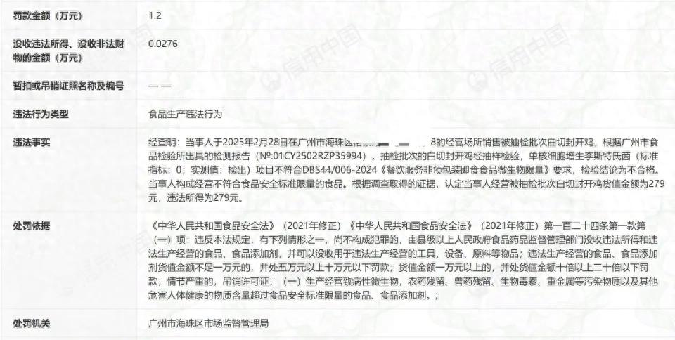 记者从“信用中国”平台查询到的行政处罚决定书详细载明,该餐厅于2025年2月28日在经营场所销售的抽检批次白切封开鸡,经专业机构检测,被检出的致病菌为单核细胞增生李斯特氏菌,该项目检测结果不符合DBS44/006-2024《餐饮服务非预包装即食食品微生物限量》标准要求,检验结论为不合格。
