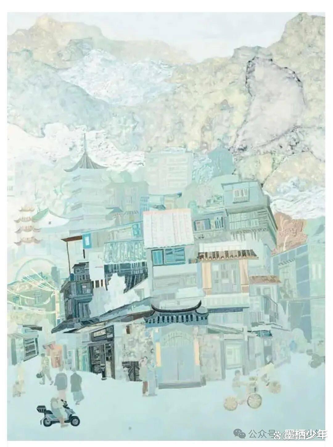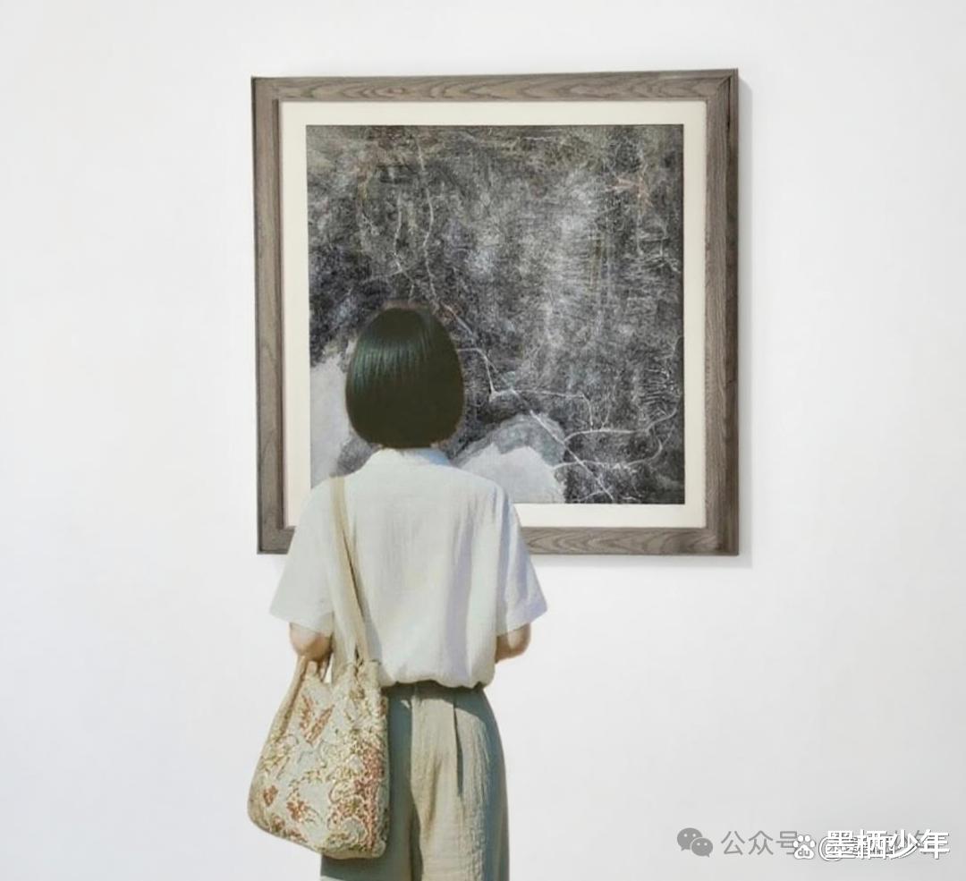 砚晖(凝视画面):"瞧这墨色!墨分五色像冰镇黑布林,咬下去爆汁的清凉感~"墨驰(智能墨镜蓝光狂闪):"光谱分析:石英砂62%+丙烯19%...标签写着'综合材料'看不见?"砚晖:“呆子!视觉效果不就是墨韵?你瞧这右下角有个女孩凝视着画面。"