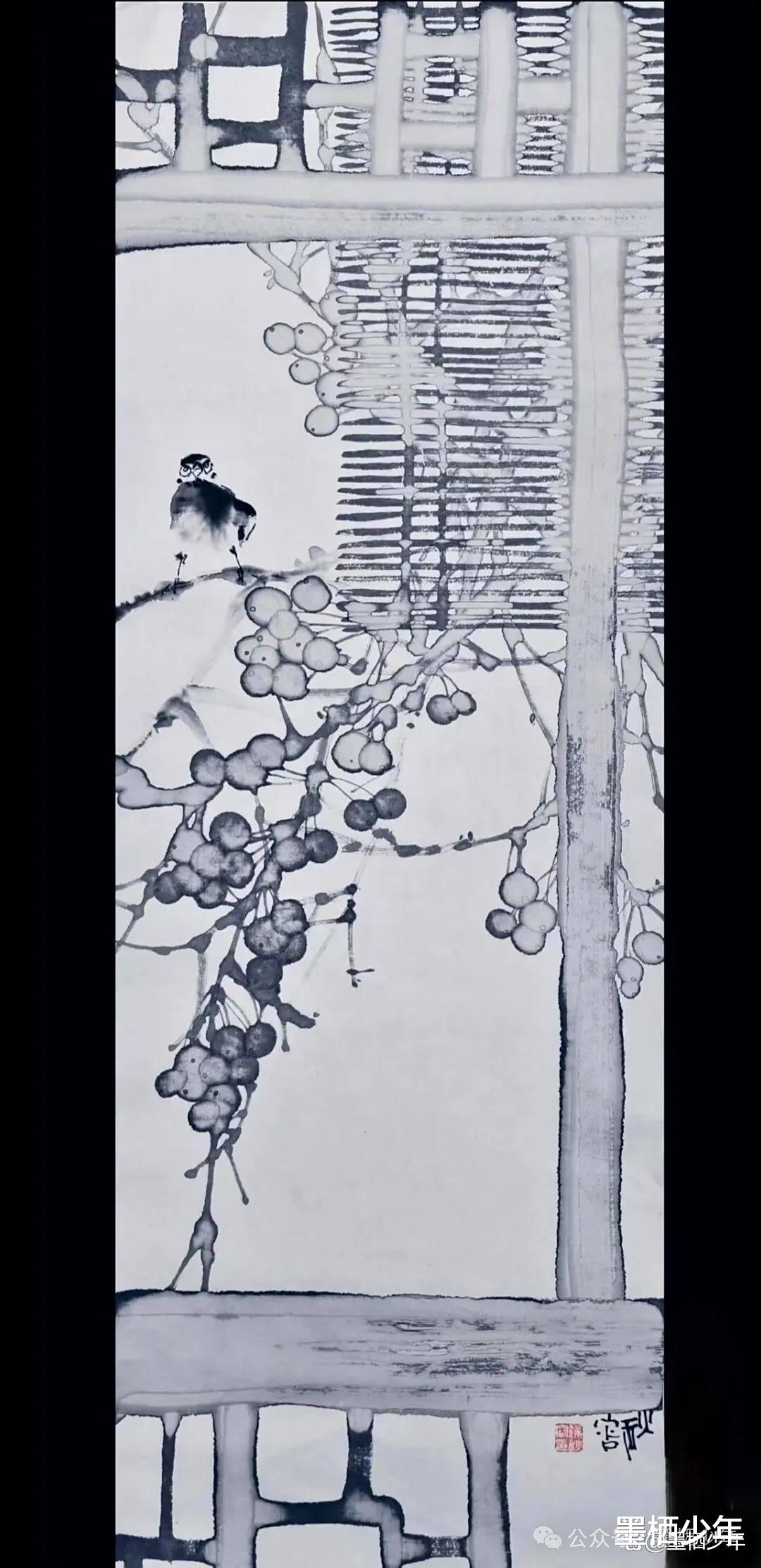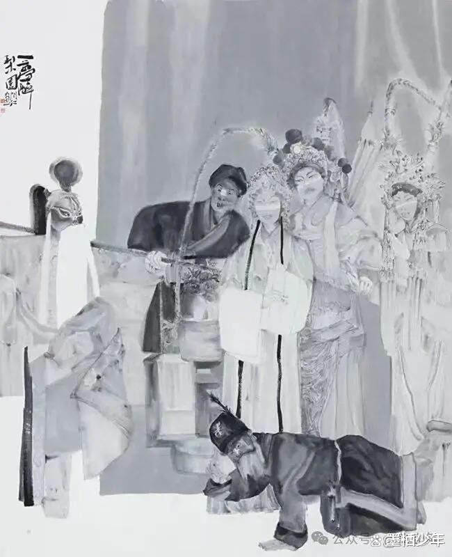 砚晖:“想起我奶奶了。她最爱听京剧。这么大一幅水墨画,让我感觉水墨淋漓,很畅快。人物脸上的光斑,如阳光从时空隧道中照射进来,如梦又如幻!”