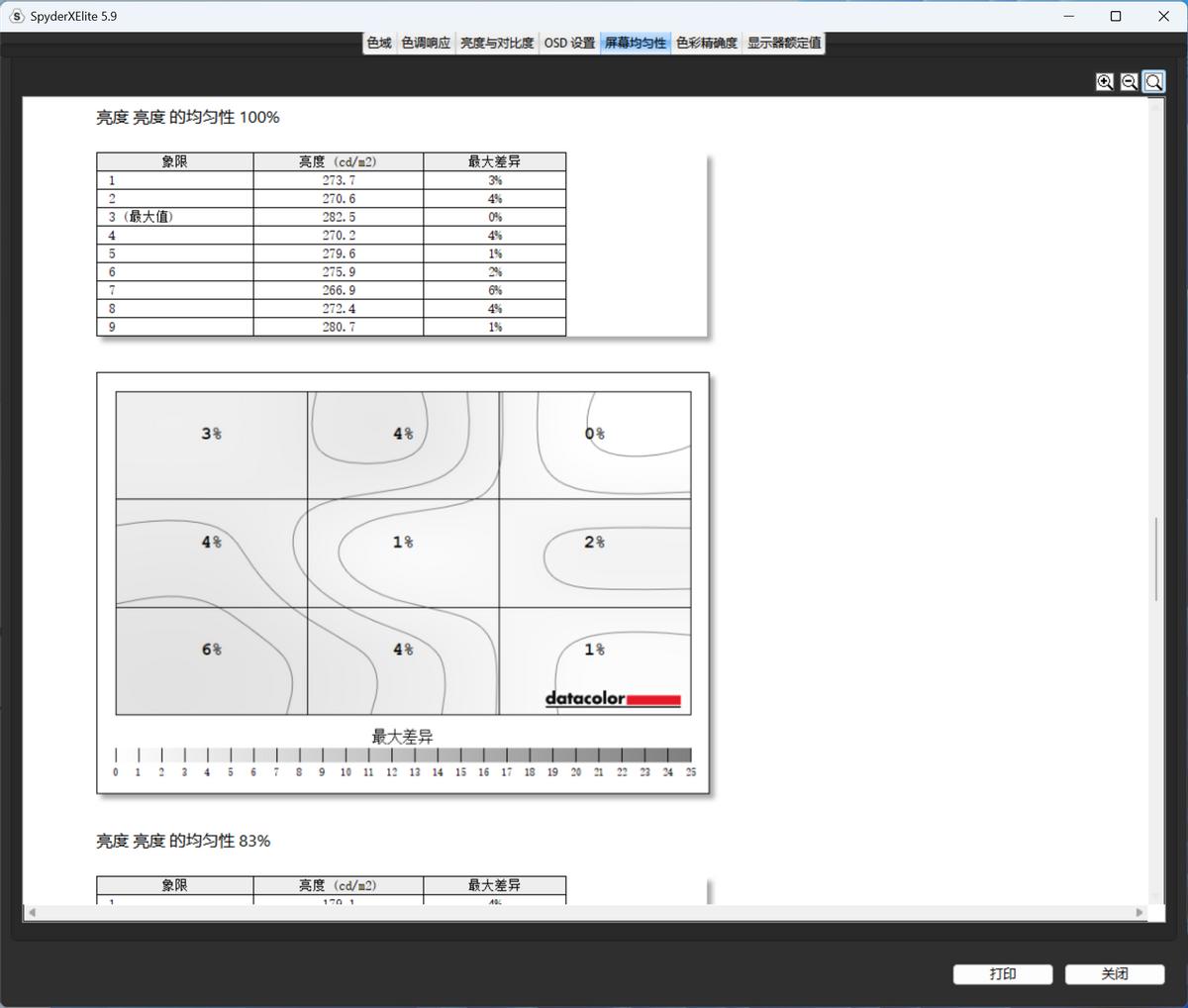 ▼关于亮度均匀性测试,实测最大差异仅为6%,这是相当不错的表现,大部分区域的亮度差异控制在1-4%之间,屏幕各个区域的亮度均匀,不会出现明显的亮度不一致问题。