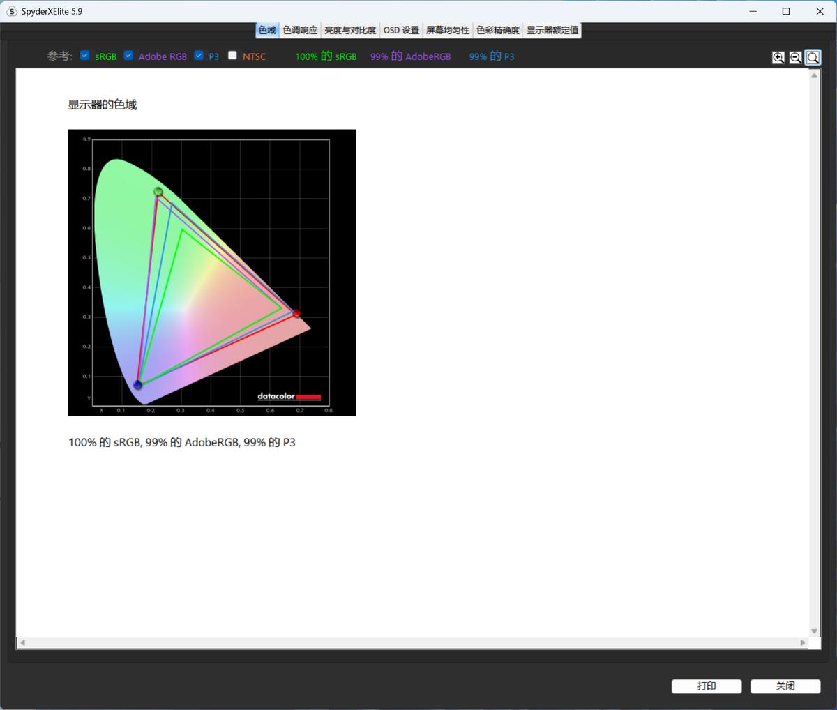 ▼除了色准外,我也测试了色域容积。如图所示,sRGB、DCI-P3和Adobe RGB完全符合标称。