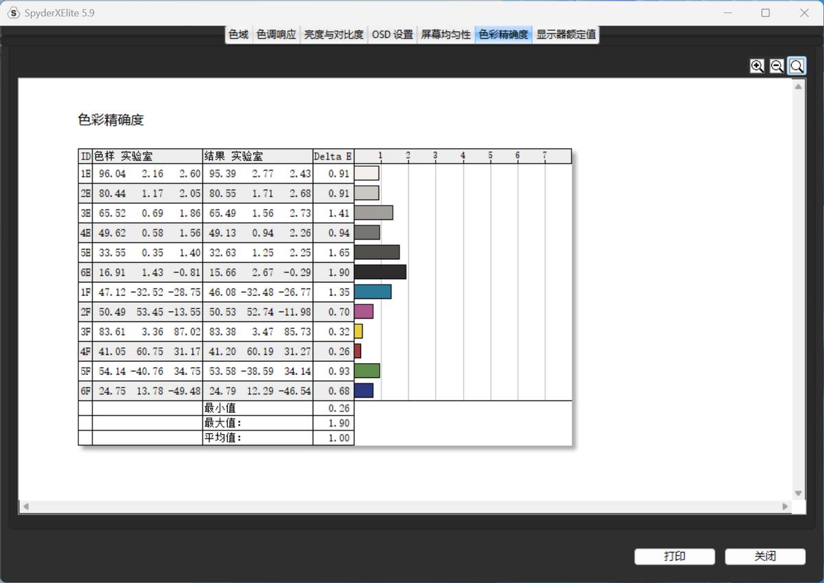 ▼首先是色准,可以看到最小值0.26,最大值1.9,最终获得平均值1.0的成绩。这样的成绩显然是做了专业的出厂校准,开箱即用的体验非常省事。