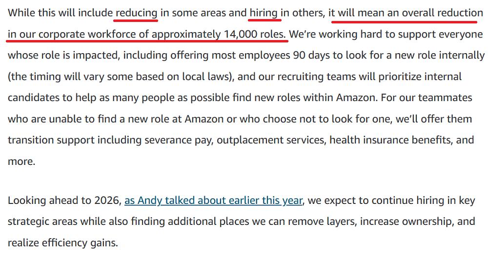 但从亚马逊公告来看,这应该是玩了点数字游戏,“14000”指得是在综合计算裁员人数和新招聘人数后,亚马逊总计将减少的企业员工数。