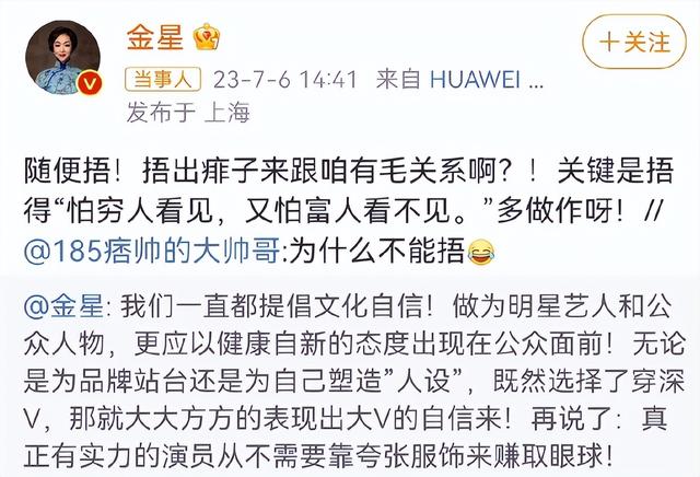 金星表示女明星穿深V捂胸是,“怕穷人看到,又让富人看不到”,同时还表示随便捂,捂出痱子来跟咱也没有任何关系,这番话真的是火药味十足。