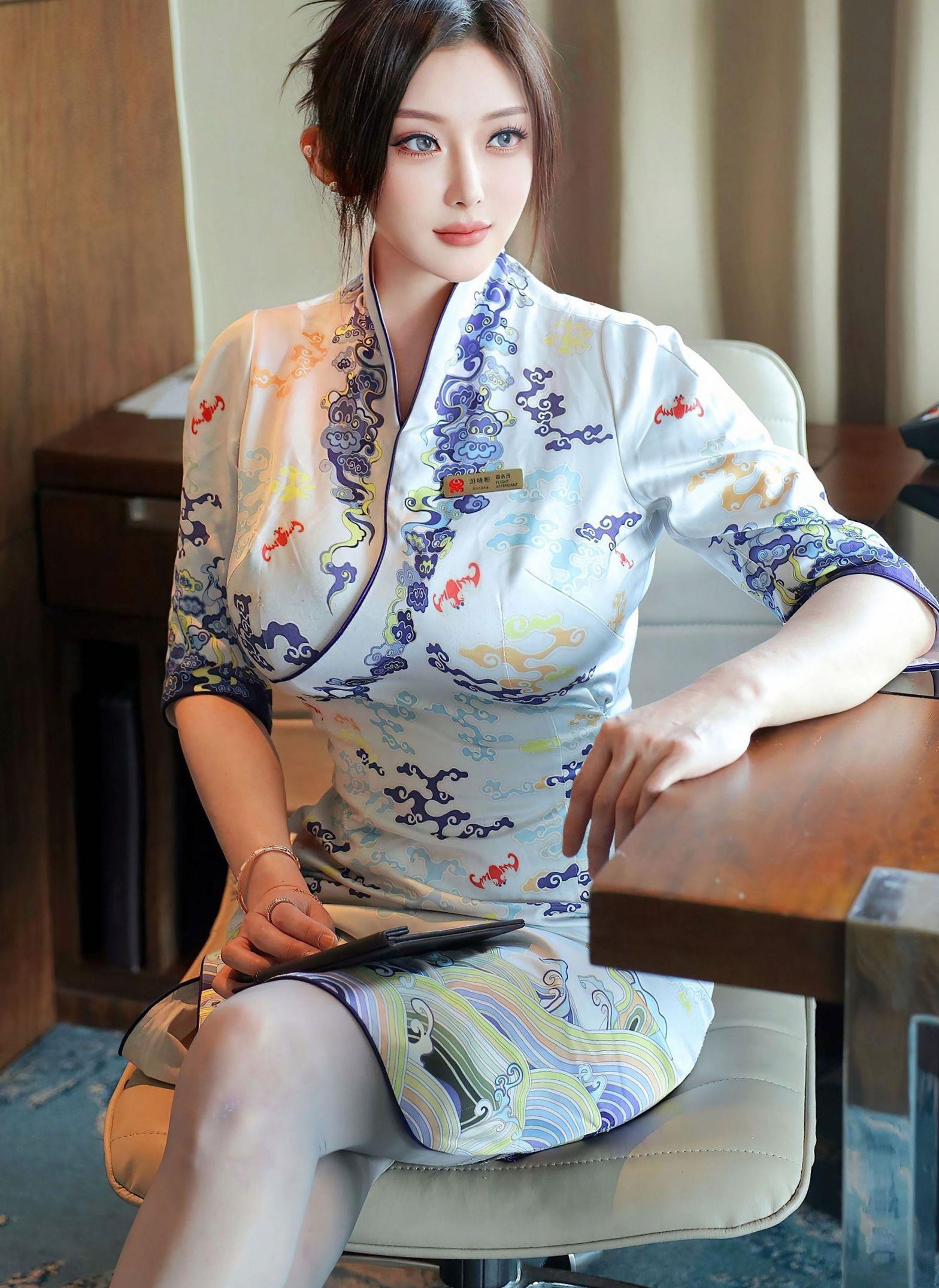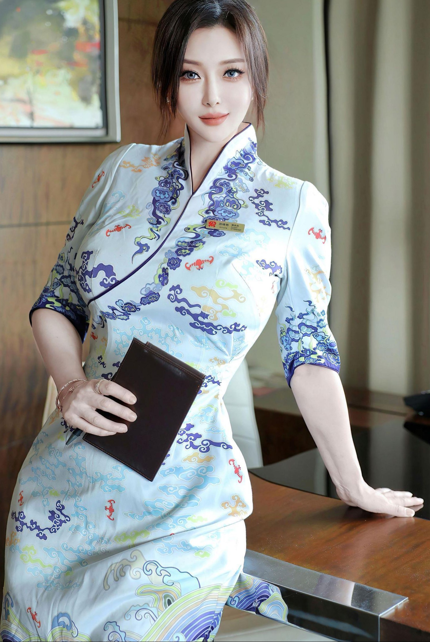 青花瓷旗袍灰丝修长美腿高跟御姐少妇